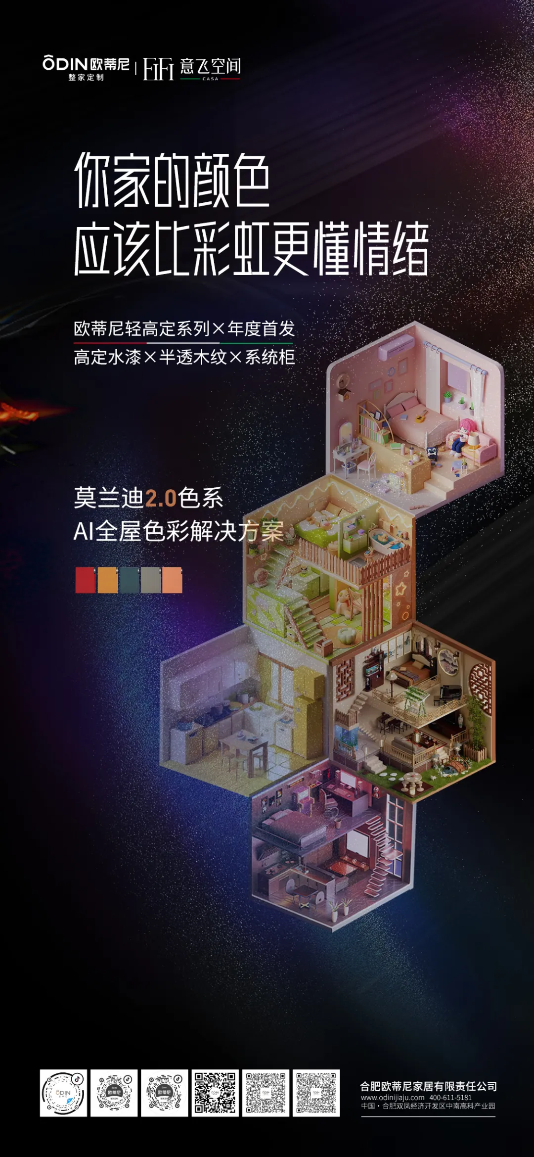 為了讓色彩搭配更加輕松,歐蒂尼還推出了AI全屋色彩解決方案。只需上傳戶型圖,AI算法便能迅速生成專屬配色方案,讓墻面、柜體、軟裝色彩無縫銜接,打造出既和諧又個性化的家居空間。在歐蒂尼的色彩哲學里,家不僅是一個居住的空間,更是一幅流動的藝術畫卷。