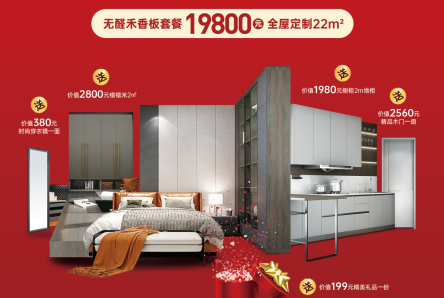 此次活動歐蒂尼推出無醛禾香板全屋定制22㎡只需19800元超值鉅惠套餐。買1送5,購買此套餐,可免費享受價值2800㎡榻榻米2㎡、價值1980元櫥柜2㎡地柜、價值2560元精品木門一扇和價值380元時尚穿衣鏡一面以及價值199元的精美禮品一份。