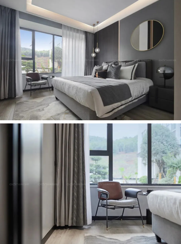 灰奢有度的弱對比藝術(shù)。灰色色系作為存在于自然界中的真實色彩,為空間點綴出豐富的光感層次。大面積采用的高級灰 +深色系抱枕,搭配時尚的銀色吊燈,演繹簡雅純粹的藝術(shù)格調(diào),如同為畫卷打上底色,碰撞出和諧寧靜的弱對比藝術(shù)。