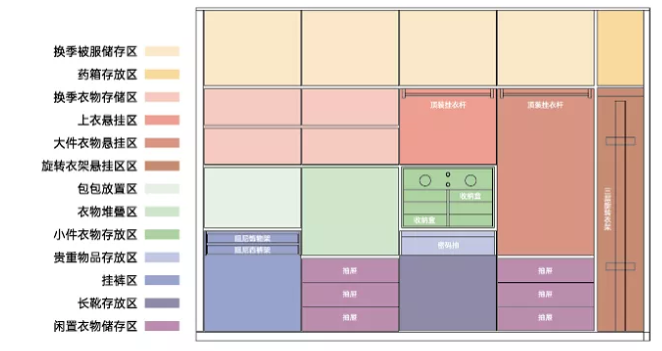 這類的整理區(qū)通常布置在最頂部,多用來放置換季的棉被等大件物品。若平時要放置的被褥較多,那么被褥區(qū)就要多設計一些。