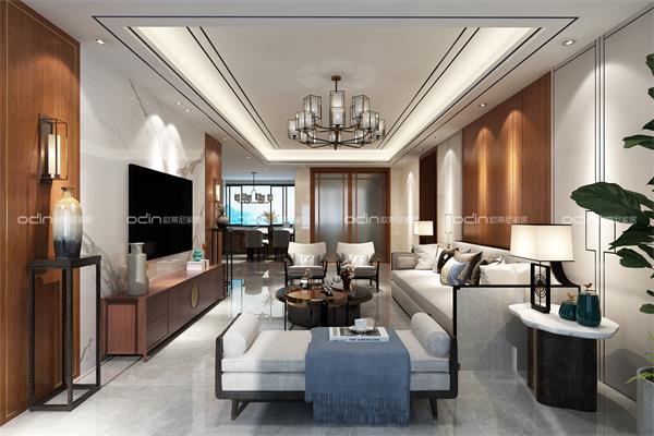 綴以陶瓷器皿,展現中式之美。頂面的中式線條設計,搭配著質感的吊燈,簡約大氣,盡顯端莊華貴。水墨壁畫背景墻搭配色調穩重的沙發軟座,一切顯得沉靜有格調。