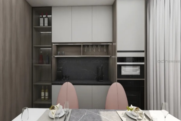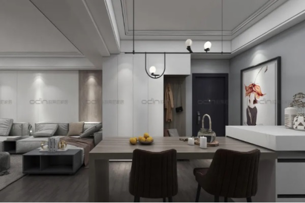 【設計說明】本案以極致簡約風格為基礎,通過一些精致的軟裝元素來凸顯質感,從中彰顯了一種高品質的生活方式。整體以白色為基調,為空間勾畫出簡潔大氣的韻味。倚墻而放的L型布藝沙發寬大而舒適,素雅的沙色色調與深色吧臺設計形成分明對比,打造出至精至雅、簡潔大方的視覺效果。