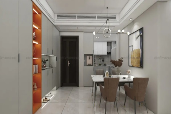 【設計說明】此方案為三室兩廳120㎡的住宅室內設計方案,設計風格主要以現代輕奢為主,根據戶型的分區,進行每個區域的空間設計;整體顏色根據啞光淺灰的為主調來設計整個空間。每個區域根據入住的人員進行設計。設計師結合愛馬仕橙來提高整體的色調,使得整體的色調不會過于灰,用玻璃門來延展客餐廳的通透性。