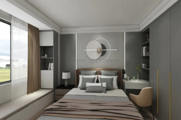 【設計說明】此方案為三室兩廳107方的住宅室內設計方案,西邊套,絕佳的采光。設計風格以現代輕奢為主,整體顏色根據啞光淺灰的主調來設計整個空間。主臥背景分色,兩邊啞光深灰,中間啞光淺灰,跟邊上的衣柜完美呼應。書桌從柜體里面延伸出來,兼具書寫及梳妝用途。飄窗柜具儲物及裝飾作用,板子用啞光深灰及啞光淺灰,保持整體統一。